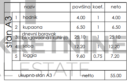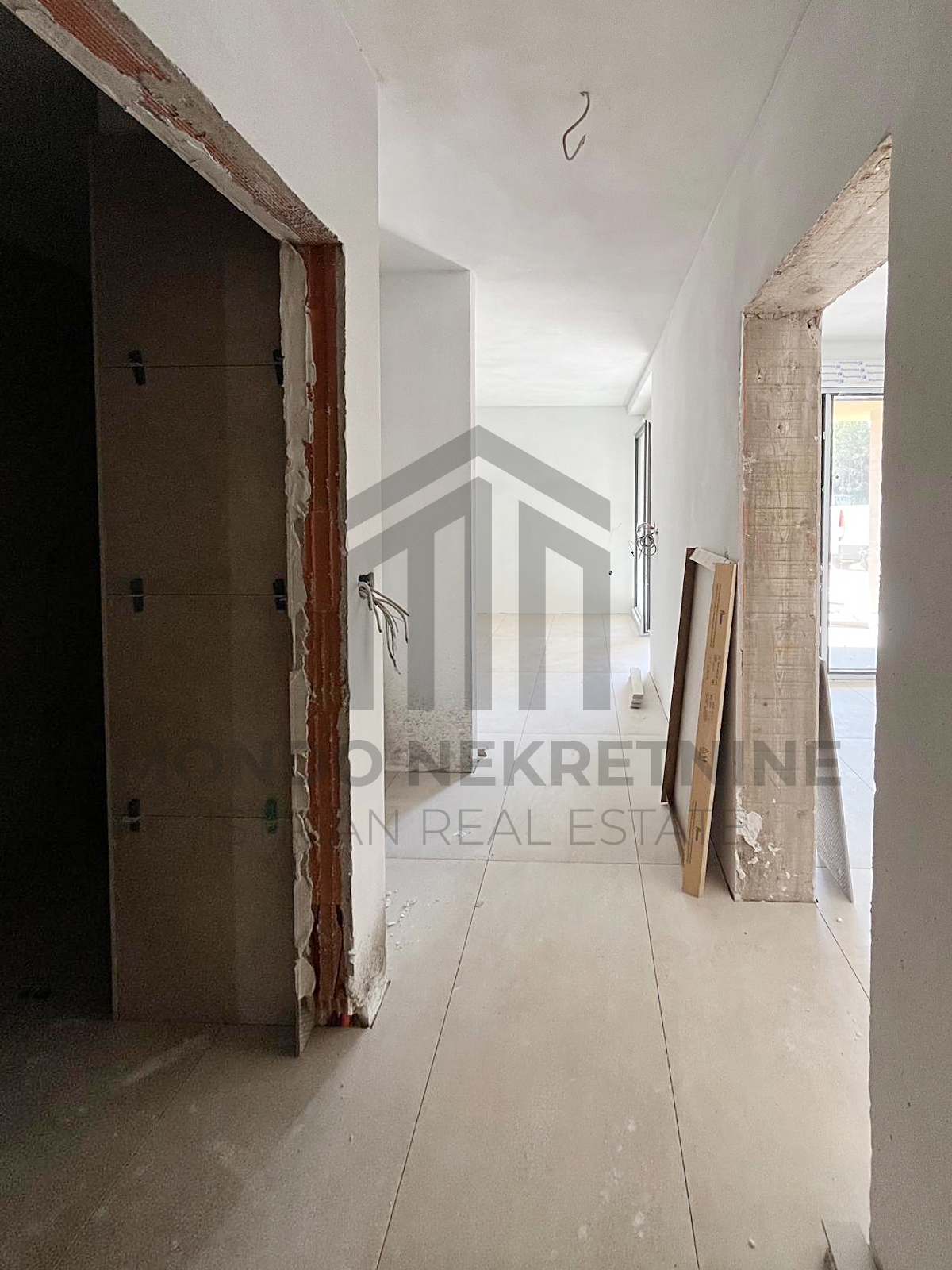 Stan se sastoji od ulaznog hodnika, dnevnog boravka s kuhinjom i blagovaonicom, spavaće sobe, kupaonice i terase. U cijenu je uključeno i garažno parkirno mjesto. Podno grijanje je u svim prostorijama.