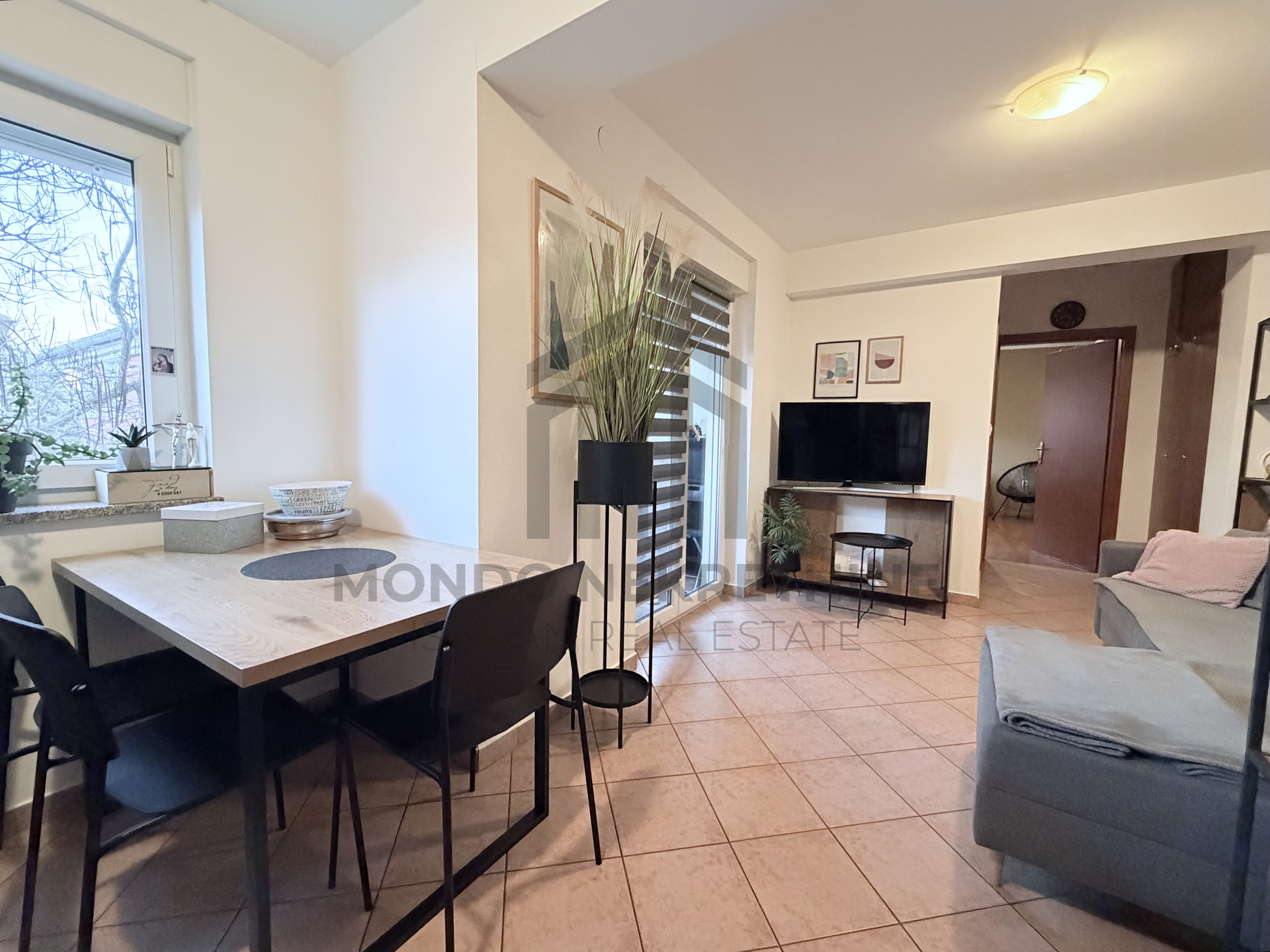 Stan se sastoji od dnevnog boravka, spavaće sobe, kupaonice te loggie, što osigurava ugodan i funkcionalan raspored prostora. Vanjska stolarija je PVC, dok je unutarnja stolarija drvena. Podne obloge čine keramičke pločice u većem dijelu stana, dok je u spavaćoj sobi postavljen laminat.