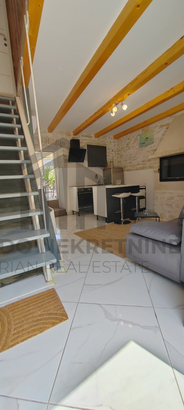 Kuća se sastoji od prizemlja i prvog kata. U prizemlju se nalazi, kuhinja, dnevni boravak, manja kupaonica i stepenište za prvi kat, te izlaz na terasu. Na katu se nalazi jedna spavaća soba i kupaonica te prostor u potkrovlju koja se može koristiti kao spavaća soba. Okučnica je kompletno uređena i sređena.
