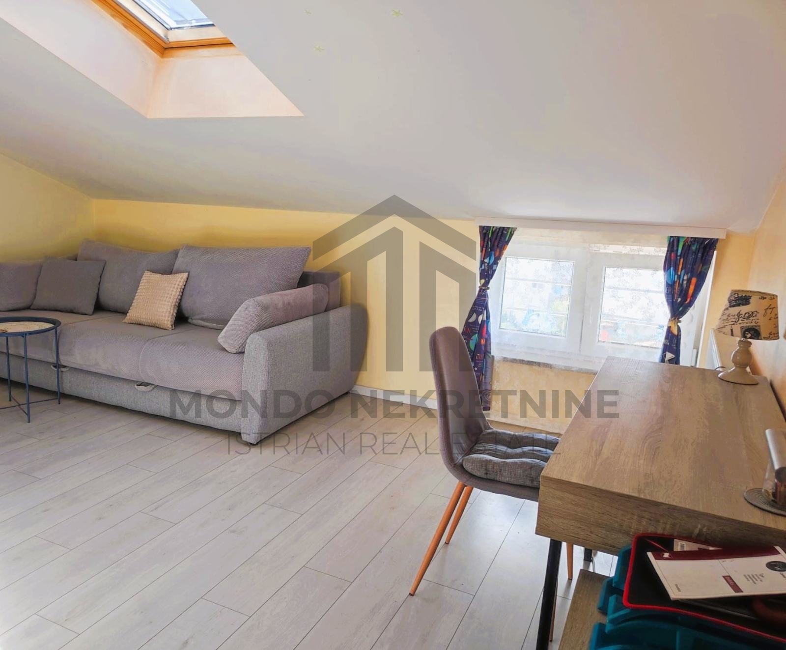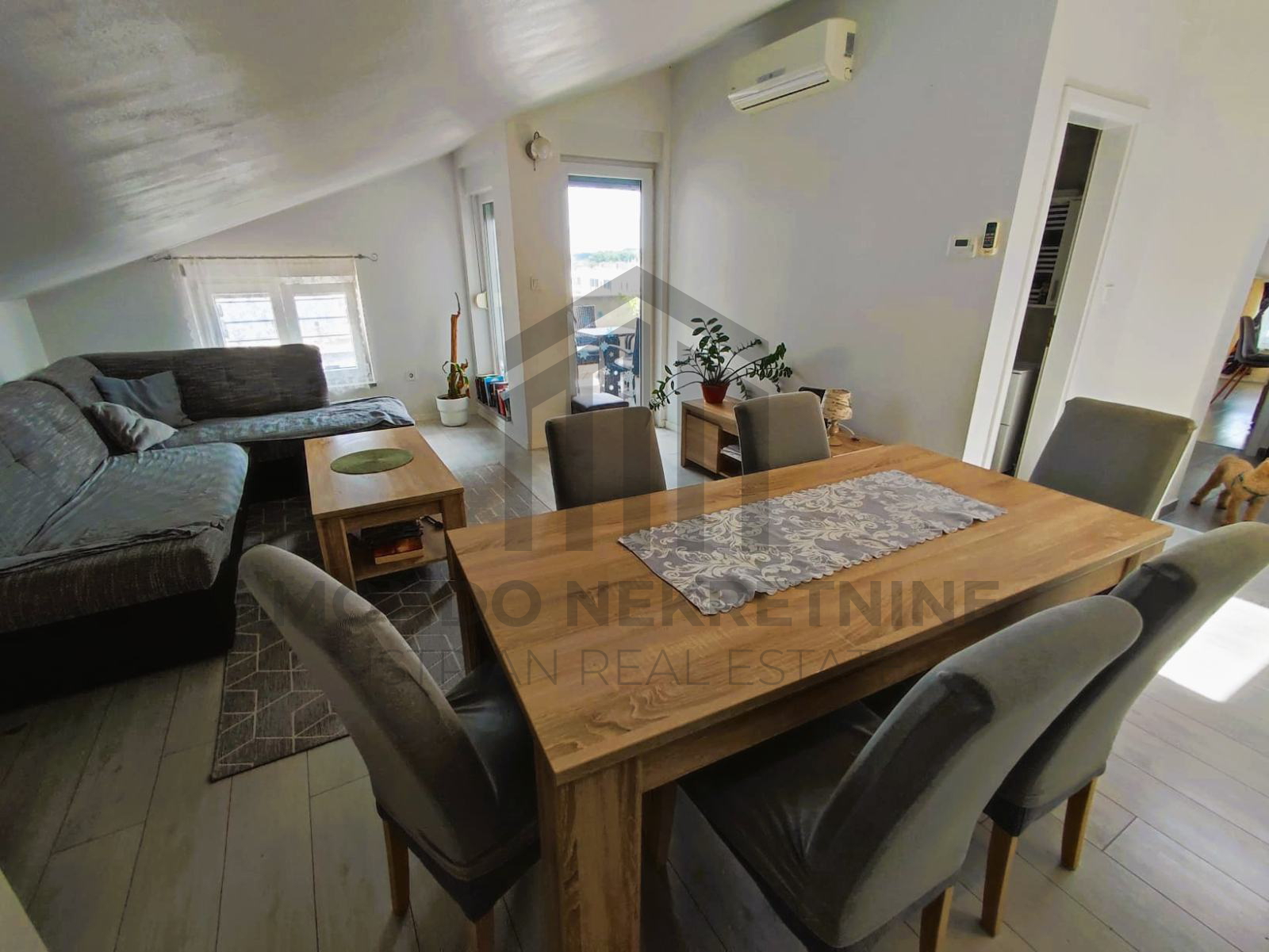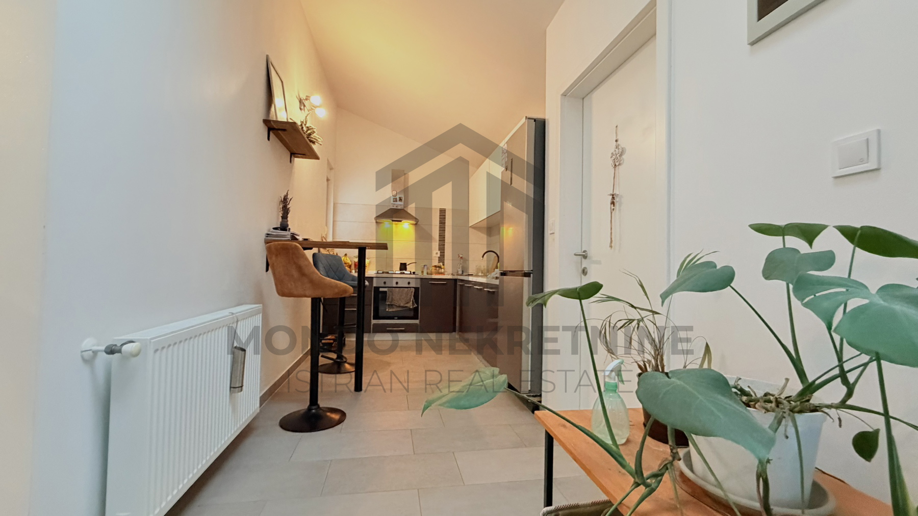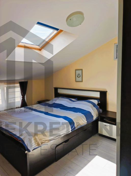 Stan se nalazi u potkrovlju te zahvaljujući Velux krovnim prozorima obiluje prirodnim svjetlom, što prostoru daje dodatnu toplinu i ugodnu atmosferu.
