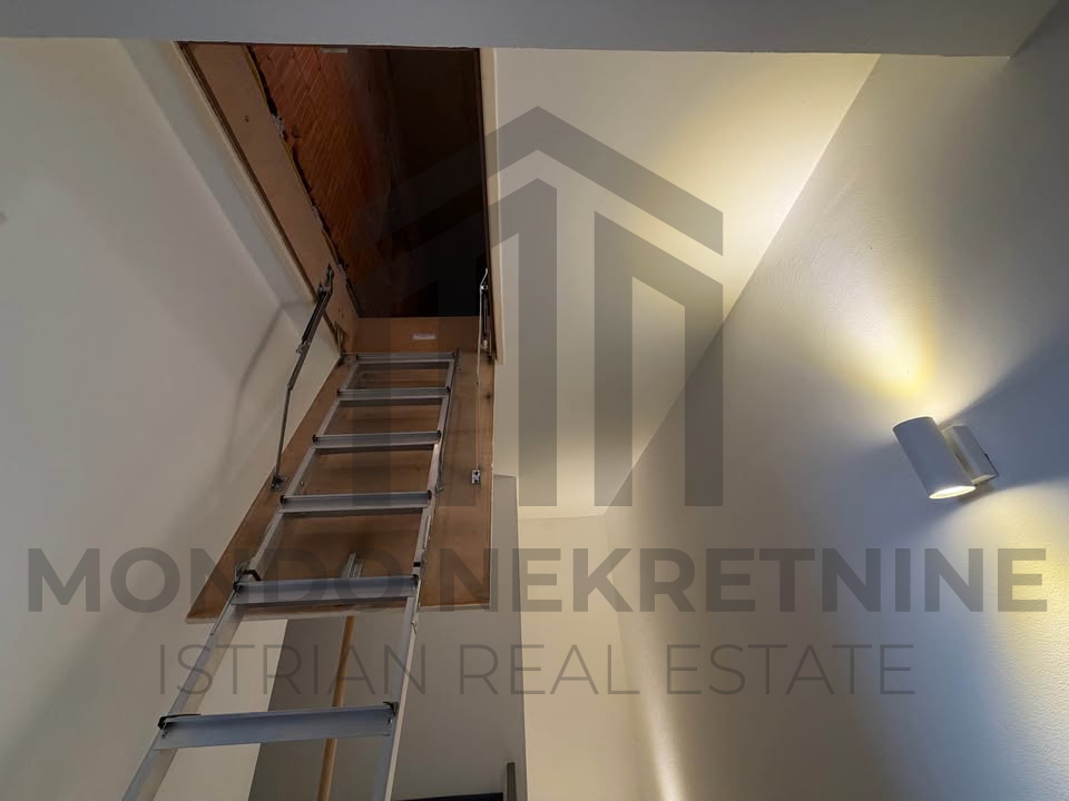 Prodaje se moderan i potpuno namješten dvoetažni stan u naselju Valdebek (Pula), ukupne reducirane površine 89 m2, s dodatnim potkrovljem od 9 m2 koje nije uračunato u kvadraturu stana.