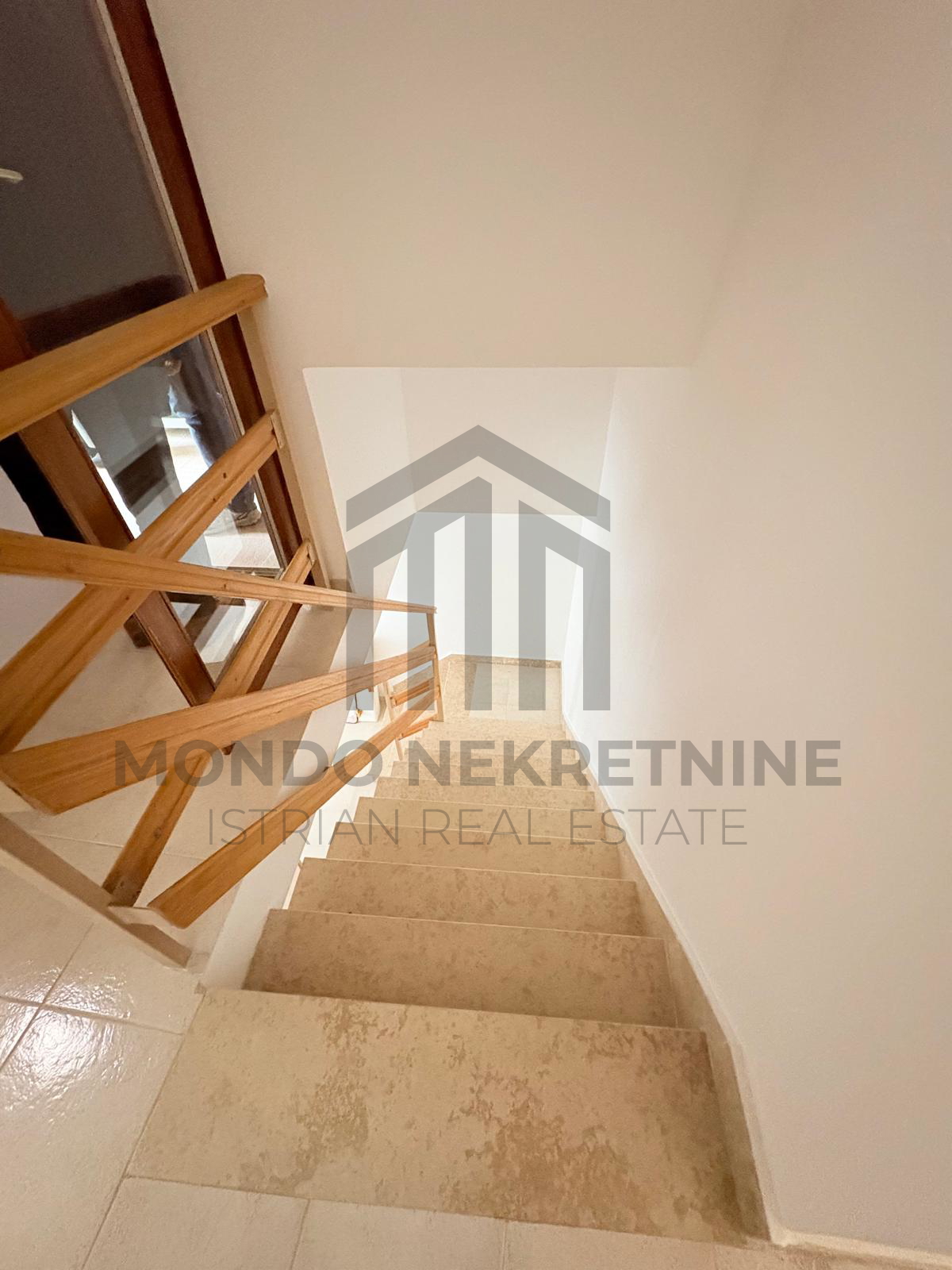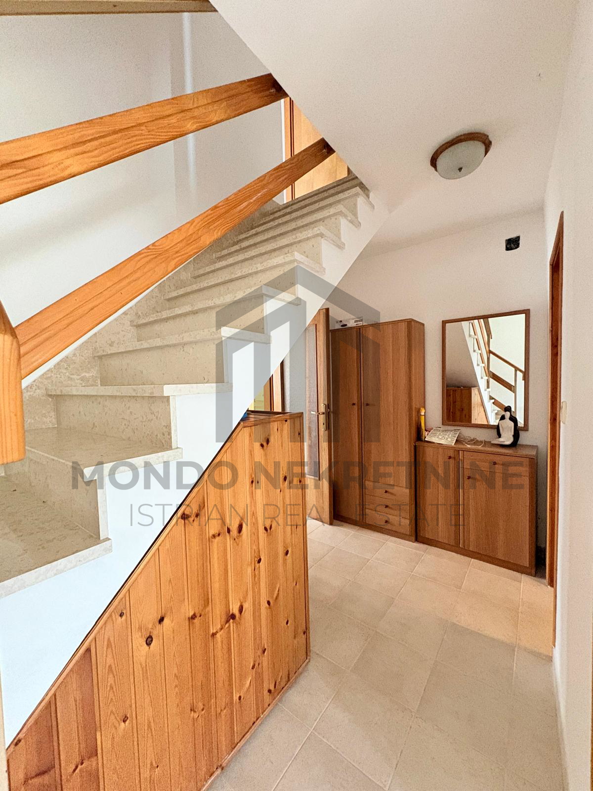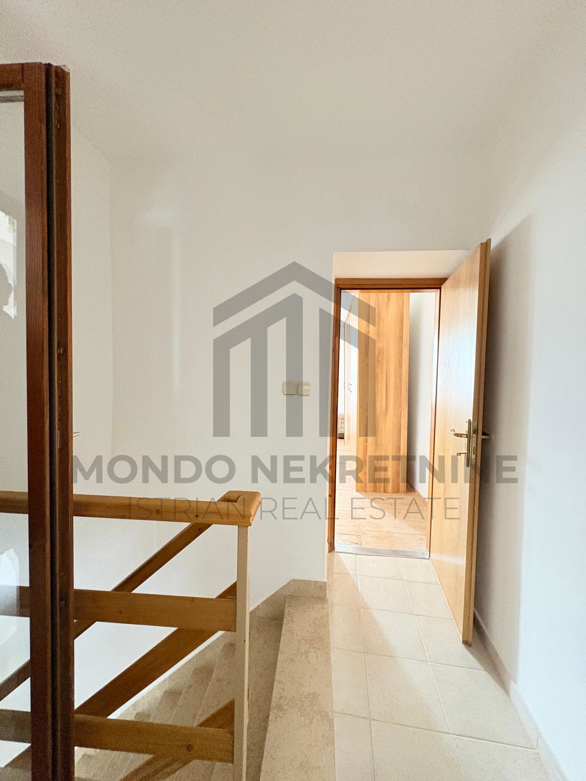 Na katu se nalaze hodnik, toalet, prostrana spavaća soba te dodatna prostorija iz koje se izlazi na terasu s pogledom na more.